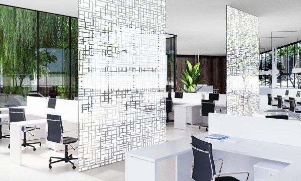 Diese Fenster-Sichtschutzfolie verfügt über satinierte geometrisch angeordnete Formen und ist ein wahrer Hingucker. Die Fensterfolie wahrt die Privatsphäre in Umkleiden, Badezimmern oder Meetingräumen.